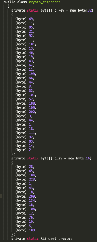Assuming that this is not actually the password, we must go back to the assembly in question and find some cryptographic references. After some browsing, a class called “crypto_component” is found, byte object names such as c_key (32 bytes) and c_iv (16 bytes), references to Rijndael, etc. I think we’re onto a winner here.