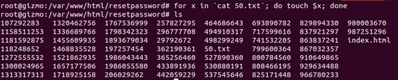I then create files (named after each of the numbers) without any file extension, inside the web server’s web root, under a “/resetpassword/” directory, e.g., “1313317317” becomes the file “/resetpassword/1313317317”. This is achieved with a bash ‘for’ loop.