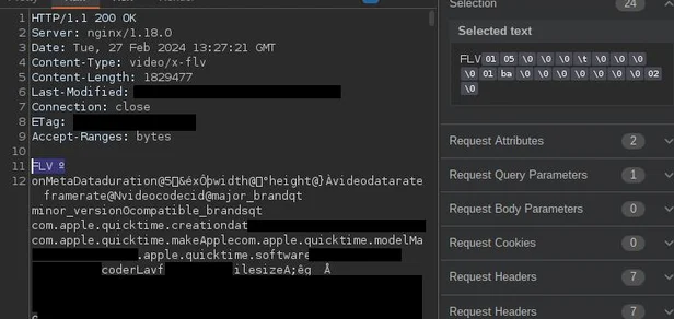 A start value of “30”. Notice how (in the response) after the FLV header, that the file starts with “etaDataduration” which was previously “onMetaDataduration”. Proof we are moving that window thing and disregarding bytes before it, as you’d expect from changing an offset. Content-length decreases further in line with this.