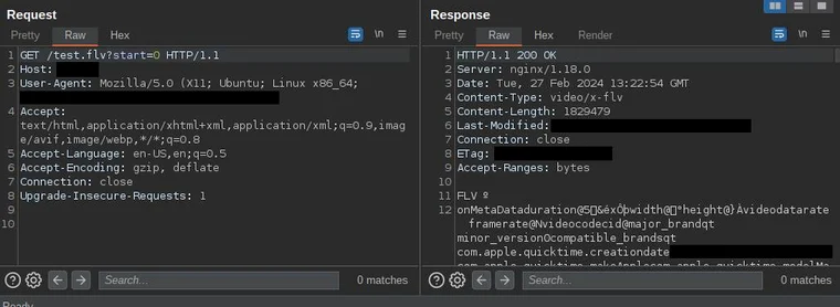 Let’s see what a normal request/response for test.flv gives us back to get some kind of baseline before we start trying to hack all the things. Note down the content-length of 1829479.