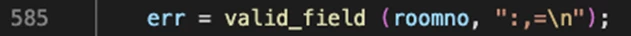 We can see that the user input to “roomno” is sent to the valid_field function together with some characters. We can assume that this is likely a blacklist of characters, but let’s go down the valid_field rabbit hole just to confirm.