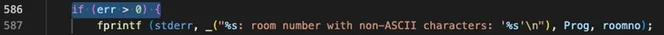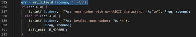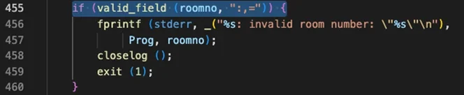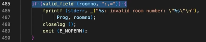 Unwrapping this package and looking at /shadow-4.5/src/chfn.c you’ll find the following treasure inside the check_fields function, namely on lines 585 to 592 with regards to setting the room number field: