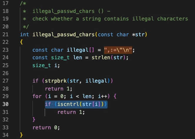 Remember at the start where I said chfn can be found in util-linux and shadow packages? Well strangely enough, the util-linux version blocks control characters via “iscntrl” in ch-common.c. In addition, it adds the “ character into the blacklist, so perhaps there is a story and some research behind that one too?