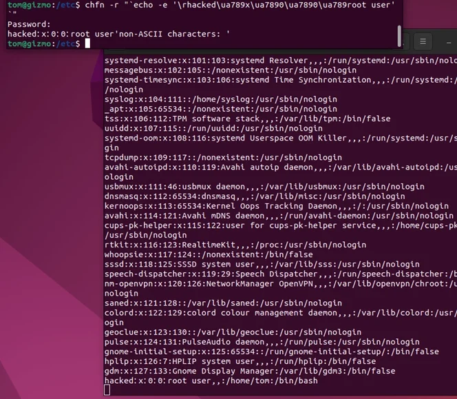 With this knowledge, I pulled ‘echo’ (with -e) out of the toolbox and started to feed control characters into the roomno (-r) parameter of chfn to see what was going down because these don’t feature in that blacklist. I had lots of fun (I’m really great at parties), but the main takeaway is that the control character CARRIAGE RETURN represented by \r or \xD (in hexadecimal) gave the biggest impact. Let me show you the bottom of /etc/passwd before any madness goes on. The ubuntu user is normal, all good - nothing to see here.