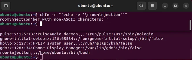 However, we make the injection with the \r control character into the roomno parameter of our user (ubuntu) and then we view the /etc/passwd file again. WHAAAAAA? Where we go?! roominjection has entered the building!