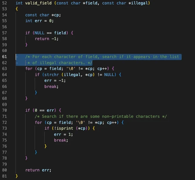 Digging into /shadow-4.5/lib/fields.c, at the valid_field function, on lines 52 to 81: