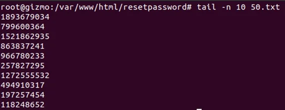 To represent creating password reset link tokens on the server side, I used the code shown earlier to seed 50 token values (randomly, between 10 million and 2 billion) and saved them to a local file, 50.txt.