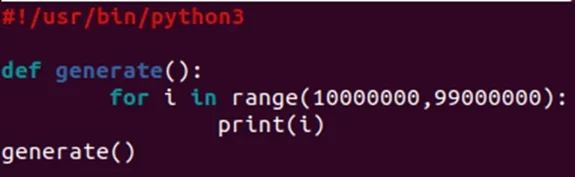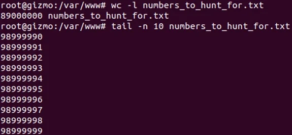 I then created a big (and I mean bigggg) file with ranges from 10 million to 99 million with this Python script. (Note, the highest number this will generate will actually be “98999999” based on this code due to the loop starting at “0” because computers and arrays, but as this is a proof of concept this is fine. We’d be very unlucky if the token was “99000000” and we could tweak the ‘for’ loop to go up to “99000001” if we wanted to accommodate, but for illustrative purposes, this is fine, just something I wanted to make you aware of!)