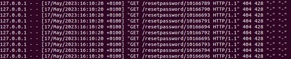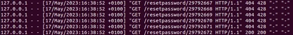 Normally we wouldn’t see it from this perspective, but if we tail -f the web server logs while this attack is going on we’ll be spammed (scrolled out!) by tons of requests with HTTP 404 being returned. If you recall back, the 404’s is the server telling the attacker the token supplied is invalid.