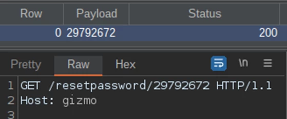 Around 30 minutes later, the needle in the haystack is found and we are rewarded with a HTTP 200 being returned in Burp’s window, for token “29792672” (“/resetpassword/29792672”).
