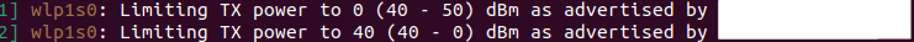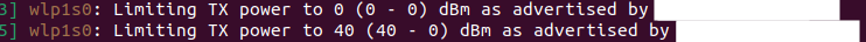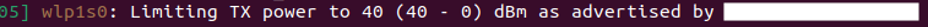 Just to double-check this, let’s have a look on the wireless side; we should expect to see “40” here if we remember from the original output from dmesg… and there it is, “Maximum Transmit Power Level: 40dBm” under the country IE.
