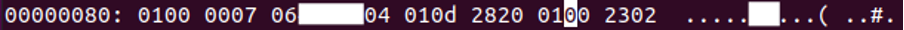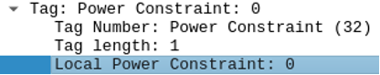 I shift my attention to the power constraint element because I want to see if I can control that, as the code says I should be able to. In the baseline beacon frame, the element looks like the one below, with a value of “0” because it isn’t reducing anything from the maximum transmit power (the regulatory bit) on the left. On the right-hand side this was always “0” if you remember.
