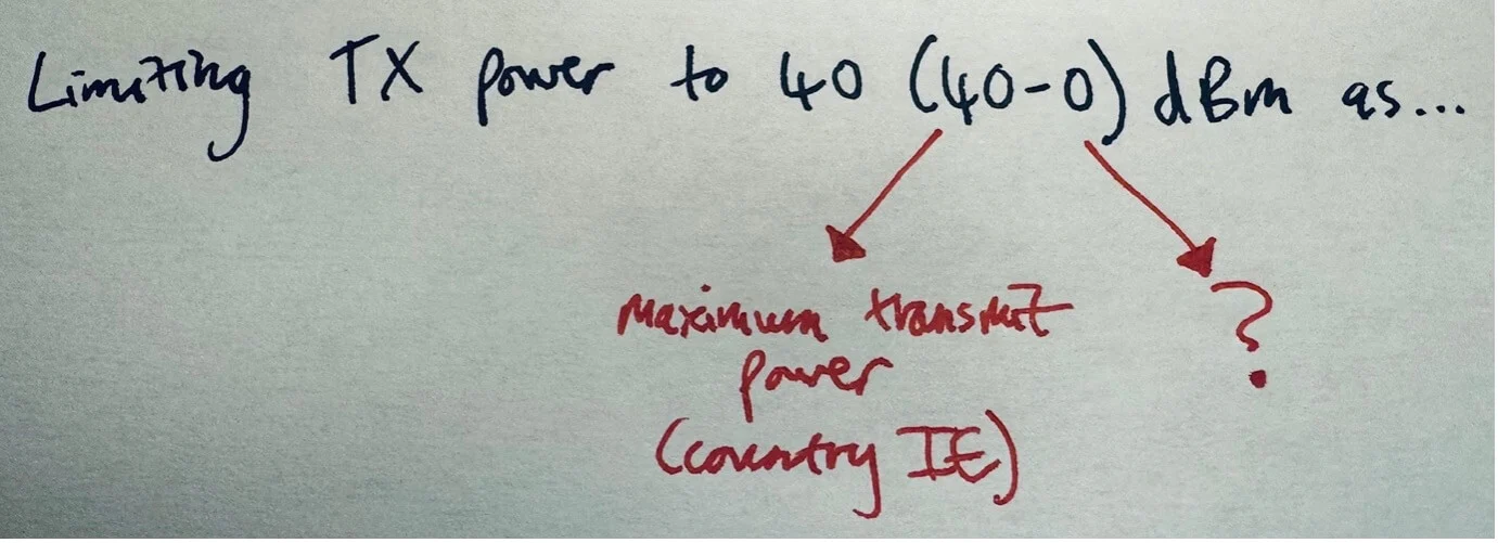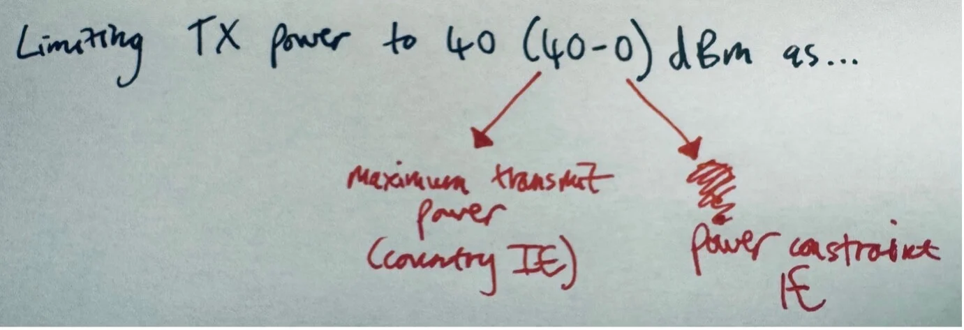 I leave the code for a bit; I read some things; by ‘things’ I mean wireless standards. So, it turns out that the 802.11h standard has an Information Element known as a “Power Constraint,” with a value set by the access point telling wireless clients by how much they should reduce their power below the regulatory limit per the configured country (the latter the maximum transmit power value in the country IE). That now all makes sense if we go back to our original dmesg output.