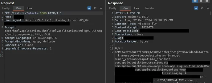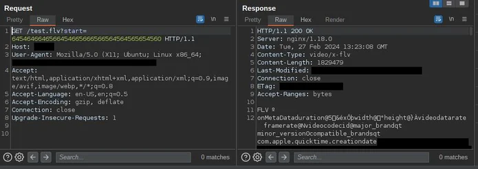 We clearly knew to expect this header in the response as shown below. If you look to the right in Burp Suite below and see the hexadecimal values of this header, you can see how this maps to the ngx_flv_header[] from the code above on line 27.