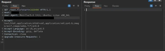 Let’s see what a normal request/response for test.flv gives us back to get some kind of baseline before we start trying to hack all the things. Note down the content-length of 1829479.