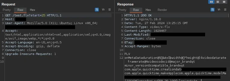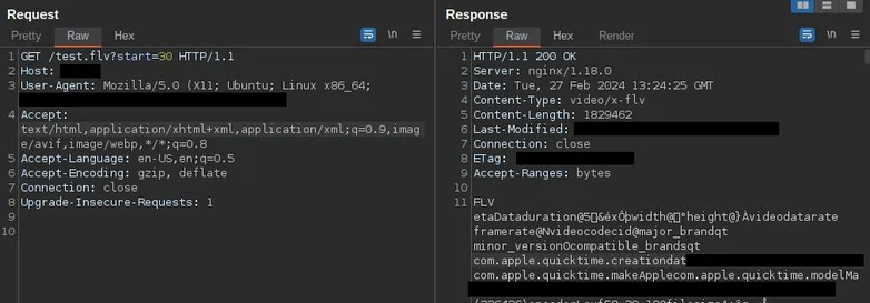 A start value of “30”. Notice how (in the response) after the FLV header, that the file starts with “etaDataduration” which was previously “onMetaDataduration”. Proof we are moving that window thing and disregarding bytes before it, as you’d expect from changing an offset. Content-length decreases further in line with this.